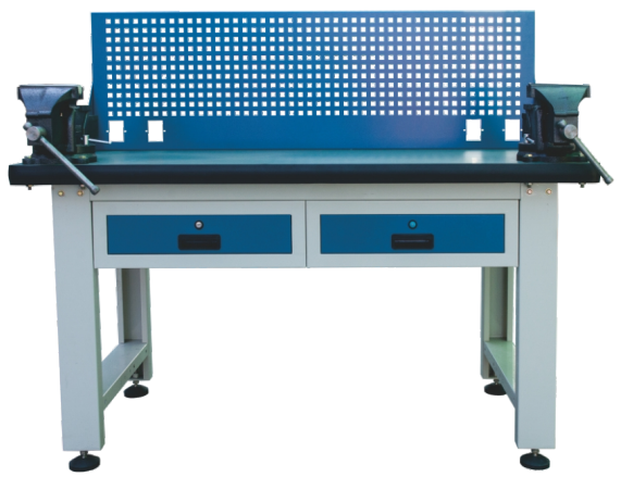 1.鉗工桌臺面采用50mm厚防沖壓板制成, 堅固耐用,韌性強.