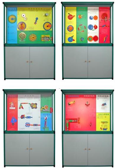 ?????本設(shè)備是根據(jù)大中專院校、職業(yè)學(xué)校的教學(xué)大綱設(shè)計(jì)的機(jī)械陳列柜,《機(jī)械基礎(chǔ)》電化教學(xué)設(shè)備。陳列柜共分十個(gè)柜和一個(gè)電腦控制臺(tái),進(jìn)行多媒體聲控同步解說演示。由PC機(jī)電腦控制順序或任選運(yùn)行每個(gè)柜模型動(dòng)作,同時(shí)電腦播放圖像或三維動(dòng)畫同步模型動(dòng)作。