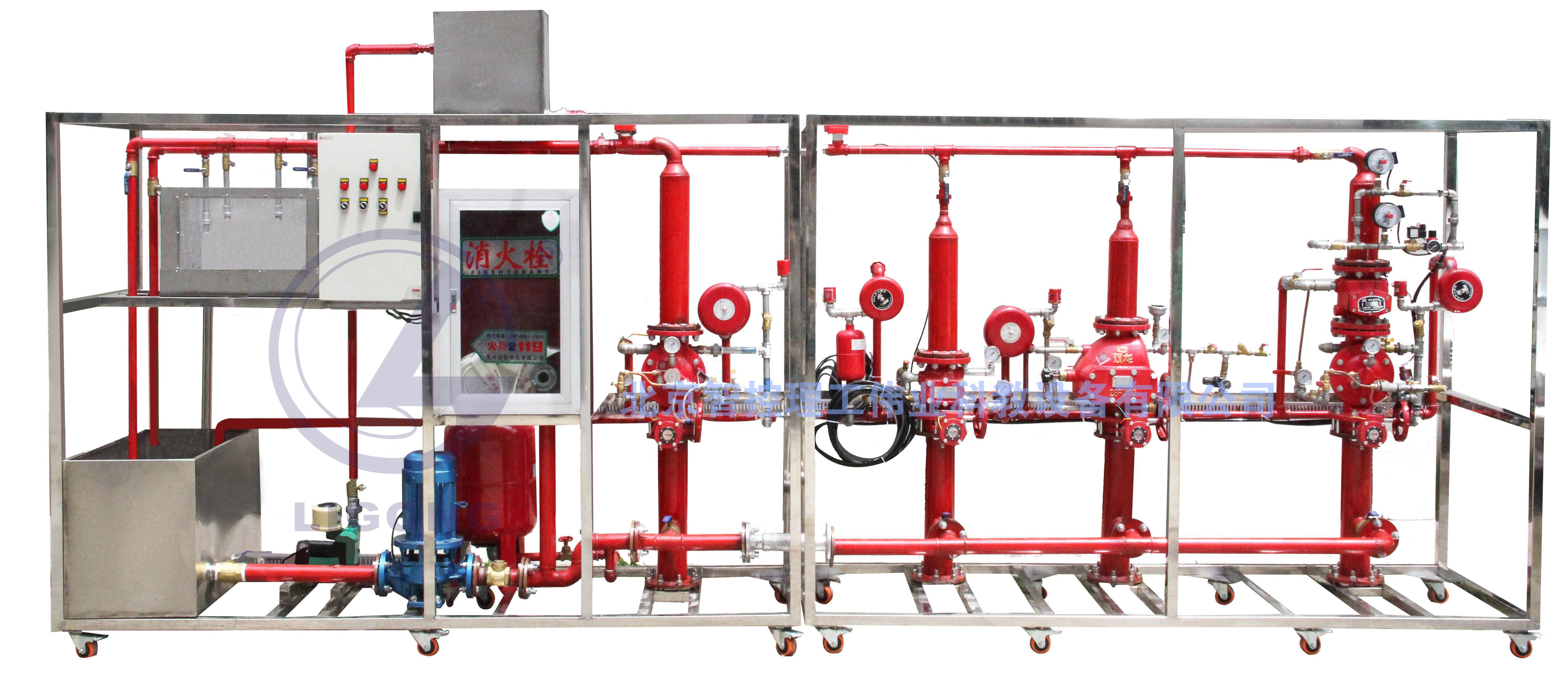 2、自動噴水滅火系統(tǒng)與消火栓系統(tǒng)共用低位消防水箱與屋頂消防水箱,并由消防水泵、穩(wěn)壓增壓設(shè)備,氣泵、濕式報警閥,干式報警閥,雨淋報警閥,預(yù)作用報警閥,水流指示器,噴頭,末端試水裝置組成完整的自動噴水滅火系統(tǒng),可以演示濕式自動噴水、干式、雨淋、預(yù)作用滅火系統(tǒng)的組成與工作原理。