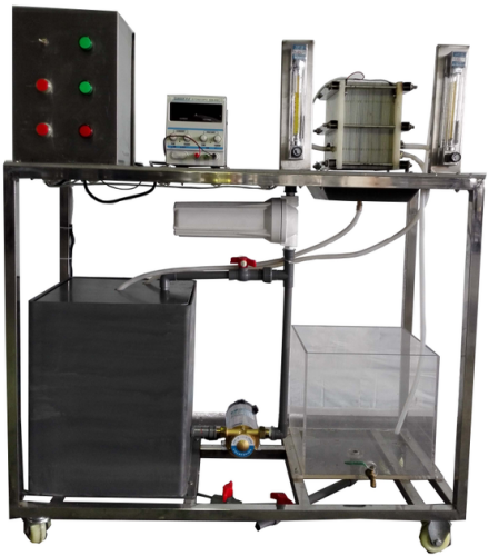 有機玻璃外箱體、電滲析器、直流穩(wěn)壓電源、配水箱、進水泵、流量計、壓力表、不銹鋼框架、控制屏。