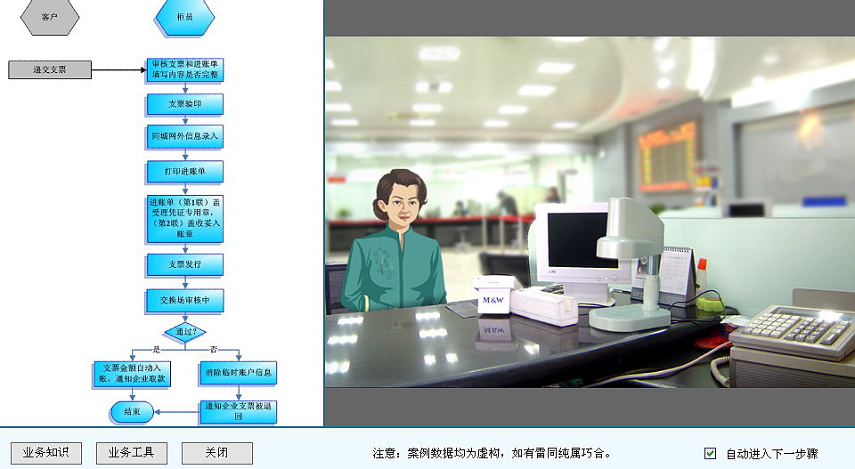 學(xué)生在經(jīng)過基礎(chǔ)的實務(wù)課程學(xué)習(xí)后,將被置于一個完全仿真的現(xiàn)代商業(yè)銀行的工作環(huán)境中,面對銀行每日的工作開始進行模擬實操。學(xué)生們將會面對虛擬的客戶提出的各種要求來進行相應(yīng)的處理。對于學(xué)生來講,實操過程中的所有操作都是自由的,他們需要通過完全自主的思考來判斷下一步的操作。譬如客戶提出的支票轉(zhuǎn)帳請求是否受理?如果不受理理由是什么?(譬如涉及支票的鑒別、簽章的鑒別等)接受以后如何操作?同時模擬系統(tǒng)根據(jù)內(nèi)置的業(yè)務(wù)邏輯自動判斷學(xué)生操作的正確性,對其業(yè)務(wù)能力進行實時的評價和記錄,并且將結(jié)果及時反饋給學(xué)生。通過每一步操作的自主思考和系統(tǒng)不斷的提示加強學(xué)生對于業(yè)務(wù)處理的理解,幫助其提高業(yè)務(wù)操作的熟練程度,并且培養(yǎng)其判斷分析能力。實操訓(xùn)練的內(nèi)容完全參照日常銀行業(yè)務(wù)操作所涉及的范圍,同時也可以根據(jù)實驗課程主題的要求進行具體的靈活配置。