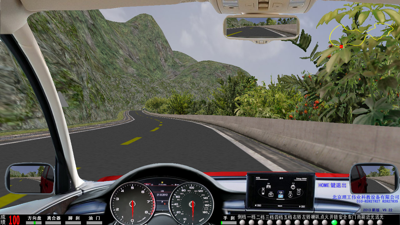2、 界面顯示:轉(zhuǎn)向、油門、剎車、離合器深淺進(jìn)度、檔位、訓(xùn)練成績,后視鏡(左、右、中)、場景地圖顯示。